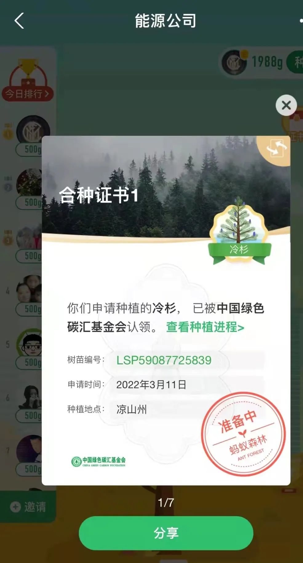 “一花一草皆生命,一枝一葉總關(guān)情。”早在2019年起,公司就通過支付寶螞蟻森林組建了一只“能源公司云種樹小隊(duì)”,如今隊(duì)伍人數(shù)越來越壯大,已有59位隊(duì)員,截止目前,在酒泉、大理、邯鄲等地,種下了冷杉、側(cè)柏、云杉、胡楊等7棵大樹。3月11日,在小伙伴的共同努力下,我們又種下了一棵冷杉樹,該樹被中國綠色碳匯基金會(huì)認(rèn)領(lǐng),將種植到?jīng)錾街莸貐^(qū)。